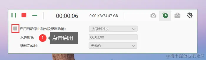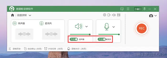 第2步:在音频录制模式中,我们可以对麦克风和扬声器进行调整,麦克风是外部声源,扬声器是内部声源,调整完毕后点击右边按钮开始录音。录音页面右上角可以 “启用自动停止和分段录制功能” ,你可以设置时间来停止录音。
