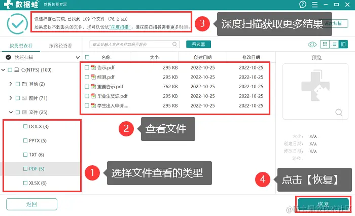 3.扫描完成之后,可以选择合适的视图对文件进行查看和选择,点击 【按类型查看】 即可通过不同的文件分类快速定位文件,将需要恢复的u盘文件都勾选完毕后,点击 【恢复】 ,并选择将恢复后的文件保存在电脑的某一磁盘中。