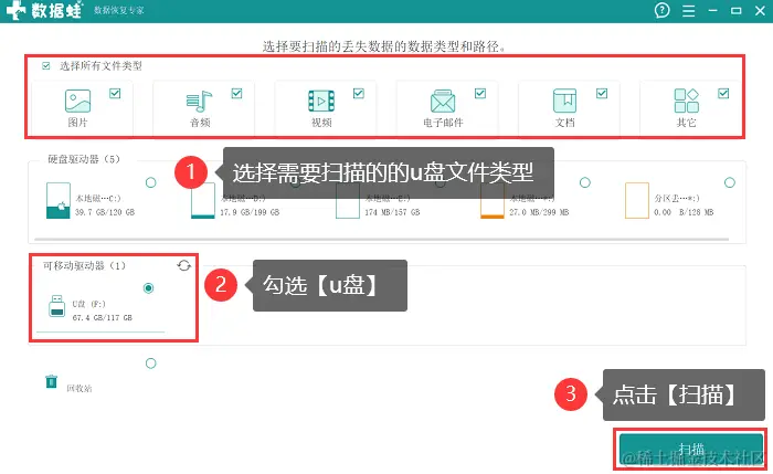 2.进入软件主界面中,可以对需要扫描的u盘文件类型进行选择,然后在可移动驱动器下勾选U盘,点击 【扫描】 ;