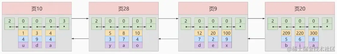 注意:新分配的 数据页编号不保证连续。页与页之间通过维护者上一个页和下一个页的编号而建立了 链表 关系。