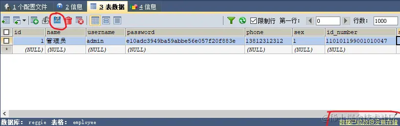 修改数据库中的数据在右下角显示数据已修改但没有保存,解决方式就是进行了修改之后点击左上角的保存即可