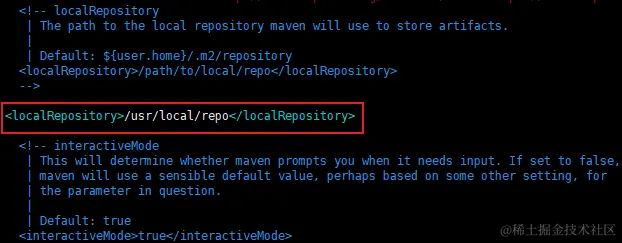 最后我们在/usr/local下创建一个repo文件夹,然后进入安装包中,打开setting.xml,加入对应的图上的一行内容,设置我们的maven的本地仓库即可