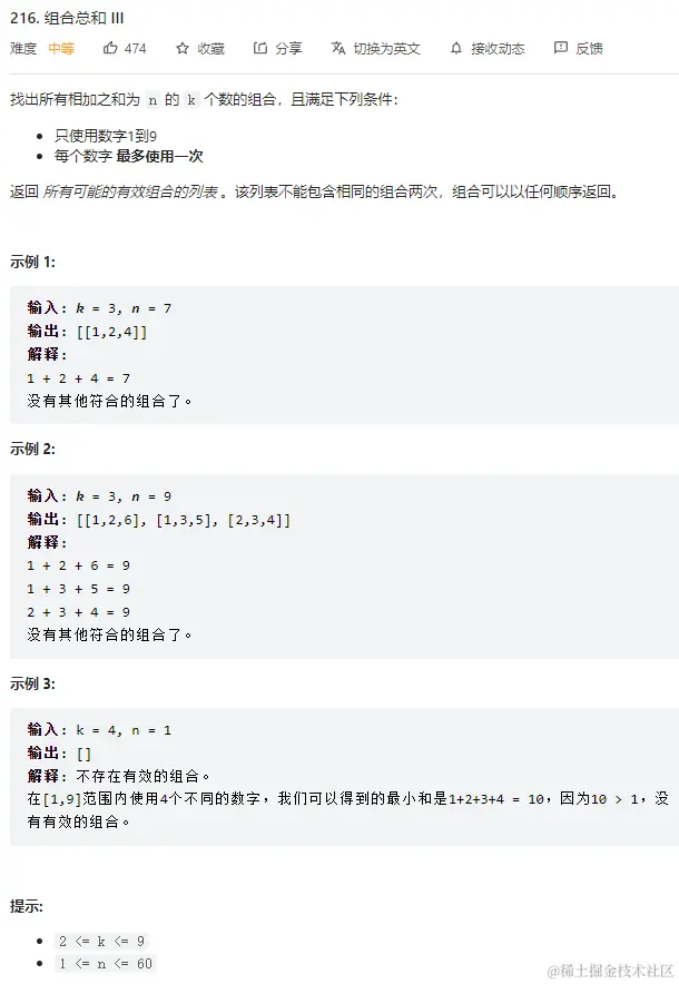 这题直接套用我们的模板就可以了,其组合的最终情况是我们的总和为我们的目标和时,其剪枝条件时总和比我们的目标和还要大时或者是我们集合中的数量超越了我们想要的数量时,那么我们可以写入我们的代码如下