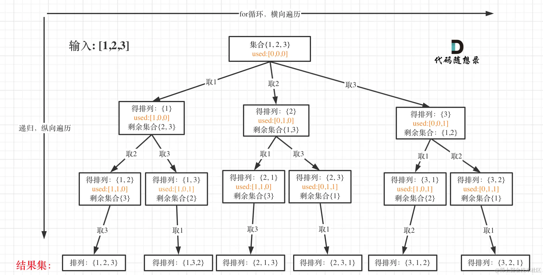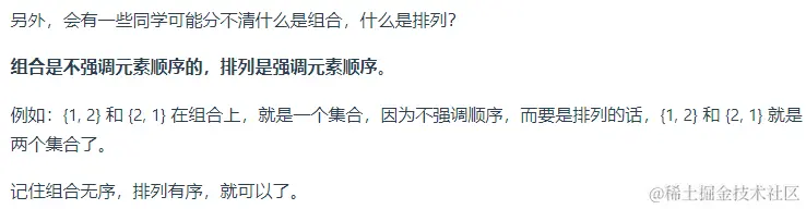 有一点我们要先提一下,任何递归算法都是非常低效率的算法,即使加了剪枝也是,所以能用for循环构建解决的算法,就不要用递归和回溯,这点要先搞清楚,不要看到一个题目就想着什么几把递归回溯,到时候给你整个超时你就知道什么是痛苦。另外有的同学可能搞不懂组合和排序的分别,他们的区别请看下图