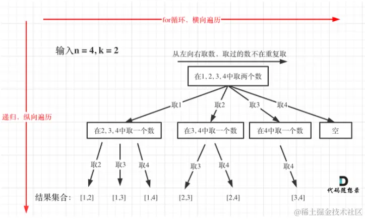 那么我们要如何做到去重呢?其实很简单,我们只要让我的起始坐标在递归时不断前进,当集合的数量到达指定数量时就收集结果,按照这样的逻辑,我们在我们收集的过程中就能够完成去重,因为实际上这样做根本不会得到重复的元素,具体请看下路