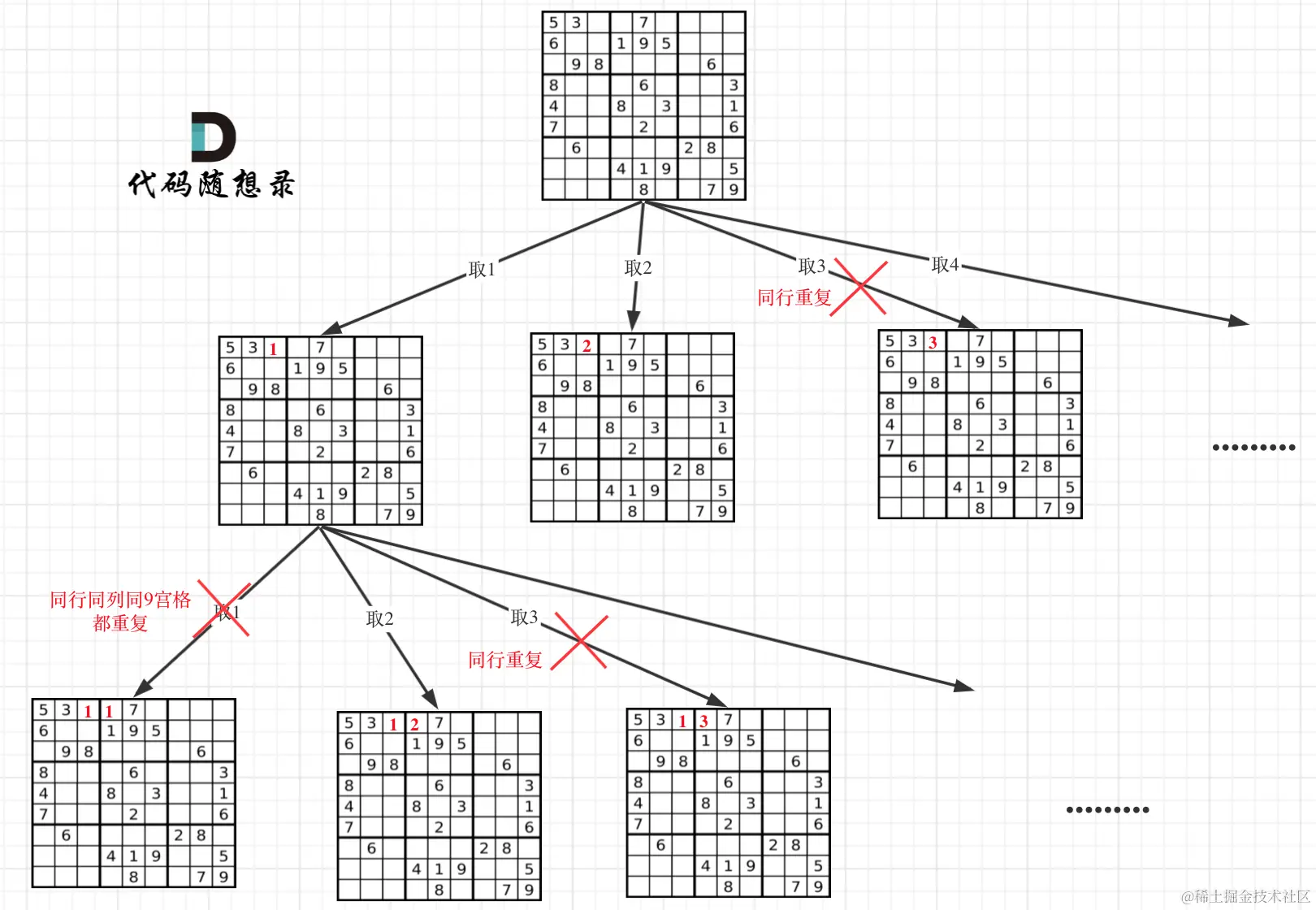 如果我们这里使用x和y的两个参数来执行我们的递归的话,最终我们会只能修改一部分的数独的值,后续的值会由于我们的边界问题导致无法被修改,因此我们这里每次递归我们都需要让我们的递归例程从0开始