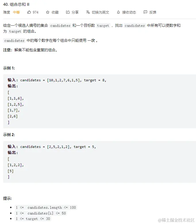 对于本题,我们就可以使用我们之前的模板来进行解题了,注意我们这里要求的是组合,其对顺序的互异是不要求的,也就是两个元素相同但顺序不同的组合,其会被认为是一个元素。那么我们就需要在做的时候,同时做到去重。