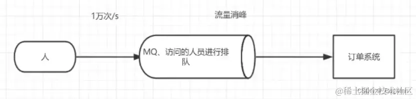 流量过大的时候,用MQ作为一个中间层,暂时存储流量,让流量在队列中排队去访问服务,从而控制直接访问服务的流量,减轻服务的实时流量压力。