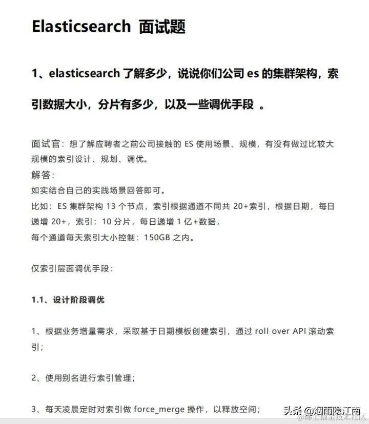 1、elasticsearch 了解多少,说说你们公司 es 的集群架构,索引数据
