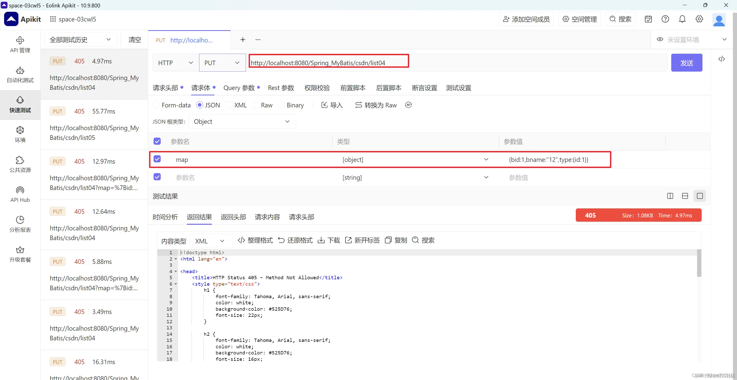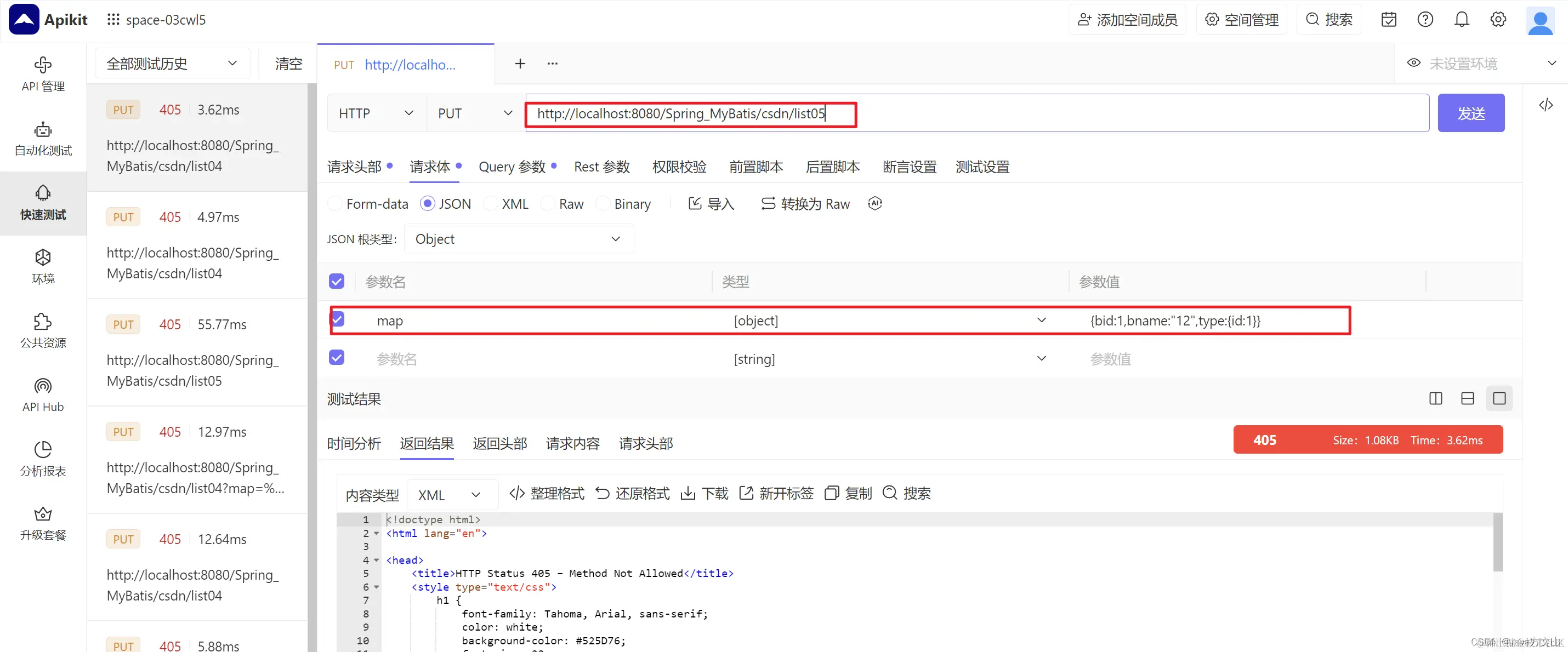 @Slf4j @Controller @RequestMapping("/csdn") public class IndexController { @RequestMapping("/list04") public String list04(Map map) { log.info("没有注解: Map:{}",map); return "hello"; } @RequestMapping("/list05") public String list05(@RequestBody Map map) { log.info("@ResponseBody: Map:{}",map); return "hello"; } }此时请求映射的请求路径为: