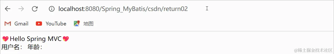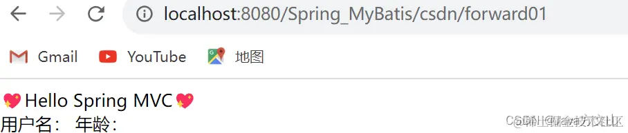 <%@ page contentType="text/html;charset=UTF-8" language="java" %> <html> <head> <title>Title</title> </head> <body> 💖Hello Spring MVC💖 <br> 用户名:${name} 年龄:${age} </body> </html>网页效果: