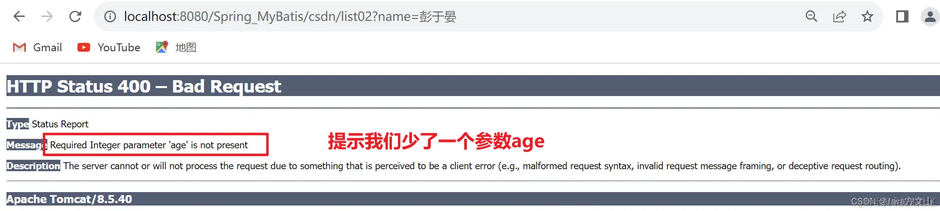 @Slf4j @Controller @RequestMapping("/csdn") public class IndexController { @RequestMapping("/list02") public String list02( @RequestParam(required = false) String name, @RequestParam Integer age) { log.info("@RequestParam注解传递参数name:{},age:{}",name,age); return "hello"; } }此时请求映射的请求路径为: