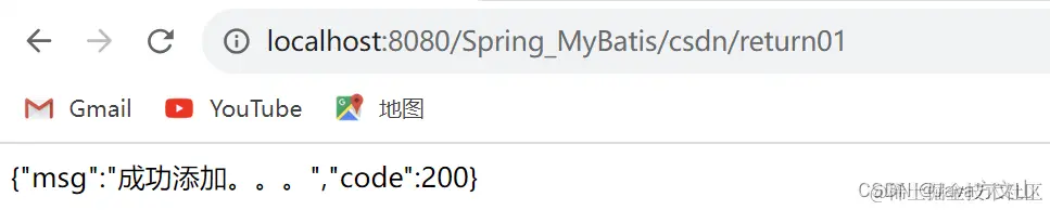 @Slf4j @Controller @RequestMapping("/csdn") public class IndexController { @RequestMapping("/return01") public void return01(HttpServletResponse resp){ Map<String,Object> map=new HashMap<>(); map.put("code",200); map.put("msg","成功添加。。。"); try { ResponseUtil.writeJson(resp,map); } catch (Exception e) { e.printStackTrace(); } } }网页效果: