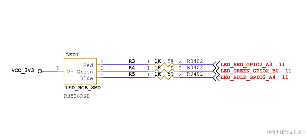 RGB LED灯整体硬件电路如下图所示,硬件电路中包含了三个GPIO控制管脚控制RGB LED灯,低电平点亮LED灯,高电平熄灭LED灯。电路简单,这边不对此进行多余的说明。