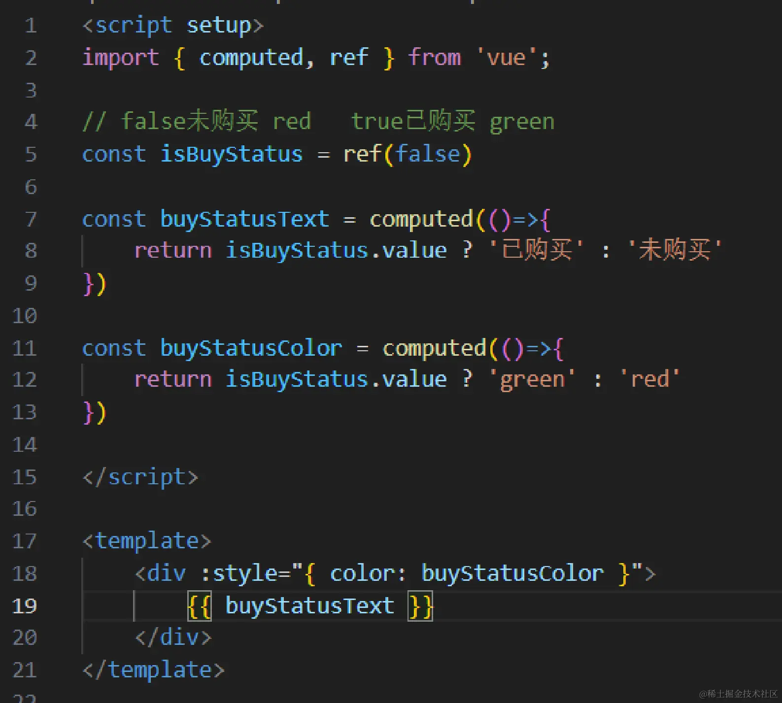 以上实例中分别在computed函数中使用箭头函数跟方法作为参数,并进行简单的逻辑判断返回结果,当响应式数据buyStatus被修改时,buyStatusText1、buyStatusText2会自动更新。