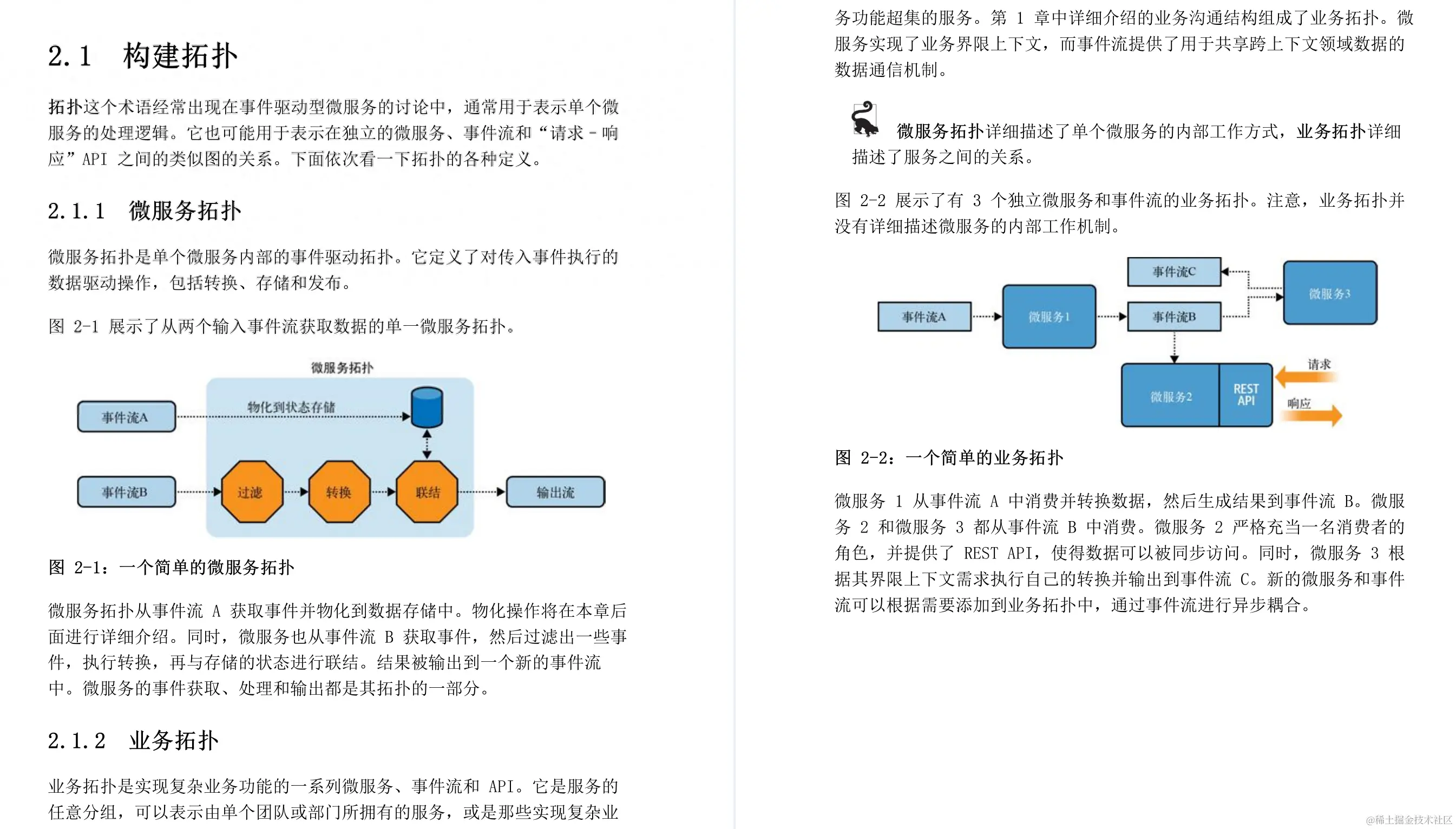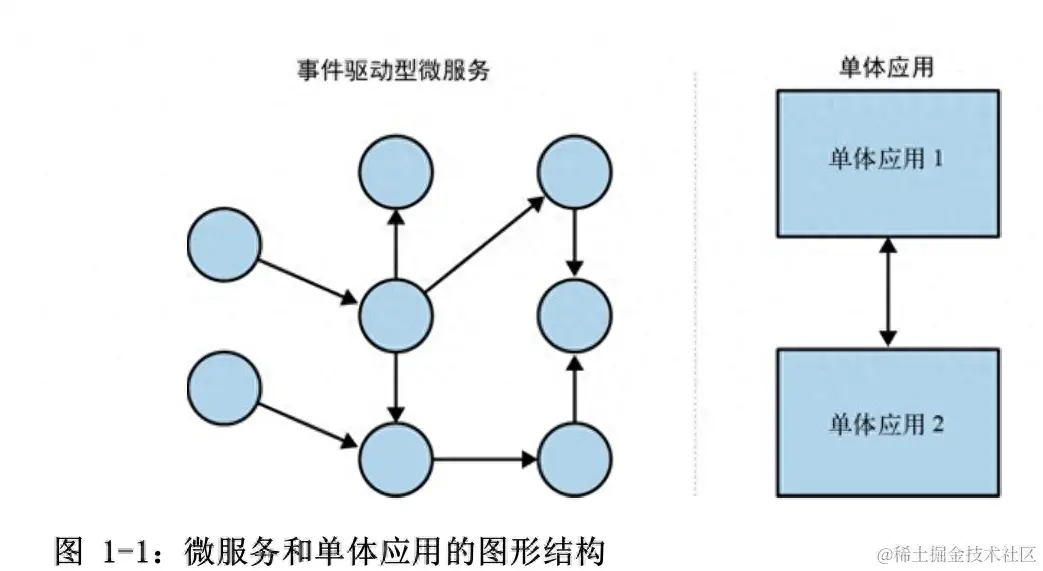 事件流和微服务的组合形成了贯穿整个组织的业务活动的相连图。传统的计算机体系结构由多个单体应用和单体应用间的通信组成,具有相似的图形结构。这两种图形结构如图
