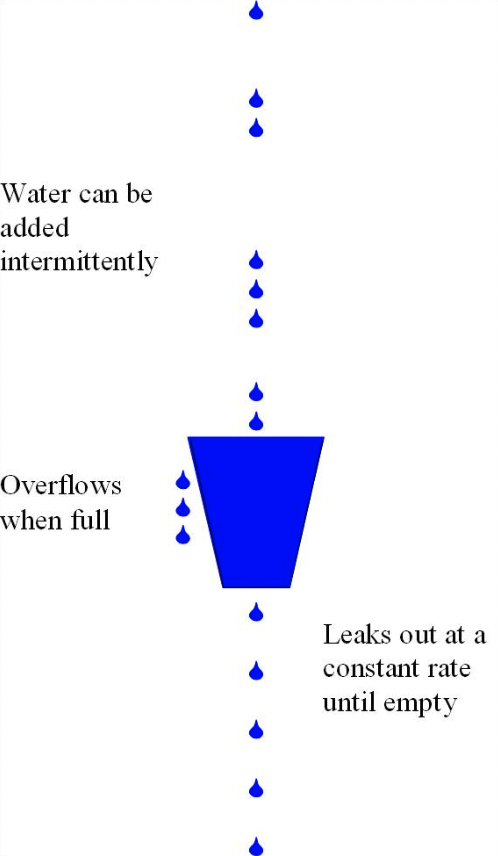 想象有一个桶,有水(指请求或数据)从上面流进来,水从桶下面的一个孔流出来。水流进桶的速度可以是随机的,但是水流出桶的速度是恒定的。 当水流进桶的速度较慢,桶不会被填满,请求就可以被处理。 当水流进桶的速度过快时,桶会逐渐被填满,当水超过桶的容量就会溢出,即被丢弃。
