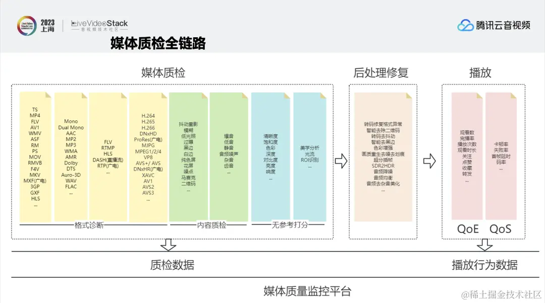 为了解决这个问题,腾讯云媒体处理(MPS)搭建了一套媒体质量监控的全平台链路。主要由媒体质检、后处理修复和播放三部分构成。媒体质检负责先找出问题,然后进行后处理修复,再到终端播放,播放之后通过用户的QoE和QoS行为数据对质检算法进行反馈。
