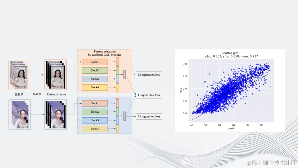 在直播场景可以通过打分,实时引导主播调整画面、灯光等,从而带来更好的直播体验。这张图展示了深度学习的核心数据网络。左边是视频到图片帧的预处理。这里我们采用的输入尺寸跟720p接近,为672×448。之所以选择这个尺寸,是因为深度学习卷积神经网络输入一般为224,我们将224×3作为高224×2作为宽,可以得到更多的图像特征。采用混合的column结构,不单单使用block4作为特征提取输入,而是采集每一层的输出,从而抬升low-level特征对质量预测的影响。同时参考不同视频之间的rank,强化学习的效果。右边是算法在线上实测的PLCC和SRCC数据。横轴是预测分值,纵轴是mos分值。越靠近中间的实线,就表示与人眼主观打分的相关性越高,算法指标越好。