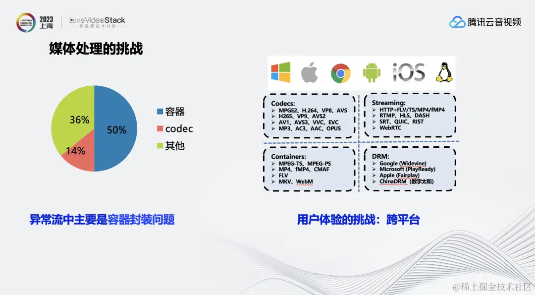 在做云上媒体处理时,有两个问题经常出现。第一个问题是发现视频有问题,但是不知道是什么问题,排查起来非常困难。第二个问题在于如何在非常多的播放平台都能够稳定的播放。这也是媒体处理的两大挑战,即异常流分析和跨平台兼容性问题。