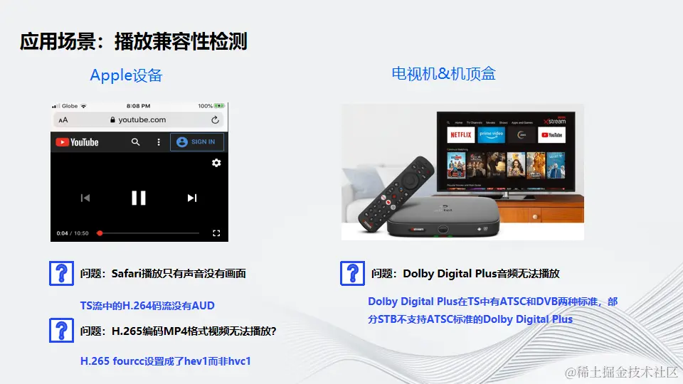 _第一个问题是关于苹果设备的兼容性。_某用户反馈他们编码出来的视频流Safari播放只有声音没有画面,而我们转码出来的确没有这个问题。通过排查我们发现TS流中的H.264码流没有AUD。AUD,全称Access Unit Delimiter,是H.264接入单元分隔符,AUD在H.264标准中的nal_unit_type为9,在H.265中nal_unit_type是35,在H264中是可选的,但TS规范要求带上AUD。如果没有带接入单元分隔符,就会导致在苹果设备上出现上述的问题。