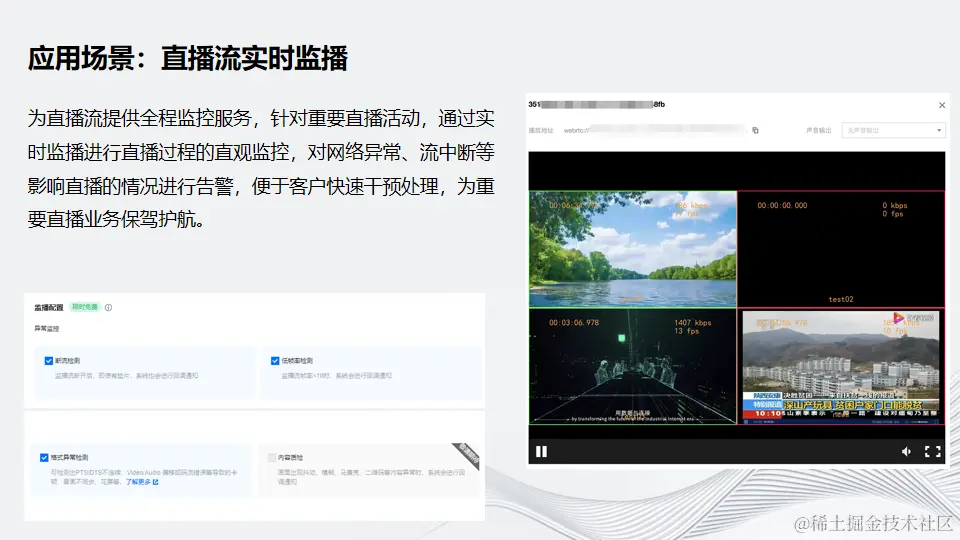 下面列举了几个诊断的应用场景。第一个场景是关于直播流的实时监控。针对重要直播活动,通过实时监播进行直播过程的实时监控,对网络异常、流中断等影响直播的情况进行告警,便于客户快速干预处理,为重要直播业务保驾护航。右图就是实时监播的画面截图。常规监控配置包括断流检测、格式异常检测、低帧率检测等。未来还会上线内容质检和无参考打分相关的能力。
