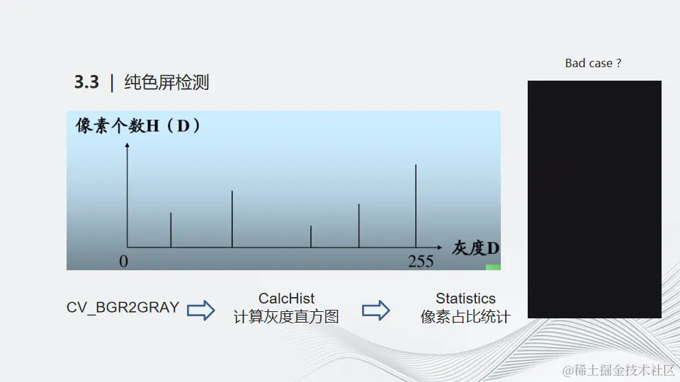 纯色屏检测算法大家可能比较容易想到,常规操作是灰度图之后统计其直方图中像素的占比。当单像素占比超过一定阈值,就认为是一个纯色屏。右图列举的是一个线上bad case。用户和我们反映一张人眼看“纯黑”的图,但算法没有检测出来。通过计算其灰度值,发现并不是单点分布在某一个像素值,它是在几个像素值临近区域分布。这个时候仅仅统计单点像素的占比达不到预期。所以我们增加了类似于滑动窗口的机制,检测邻近像素累加值的占比,从而解决了这样的bad case。