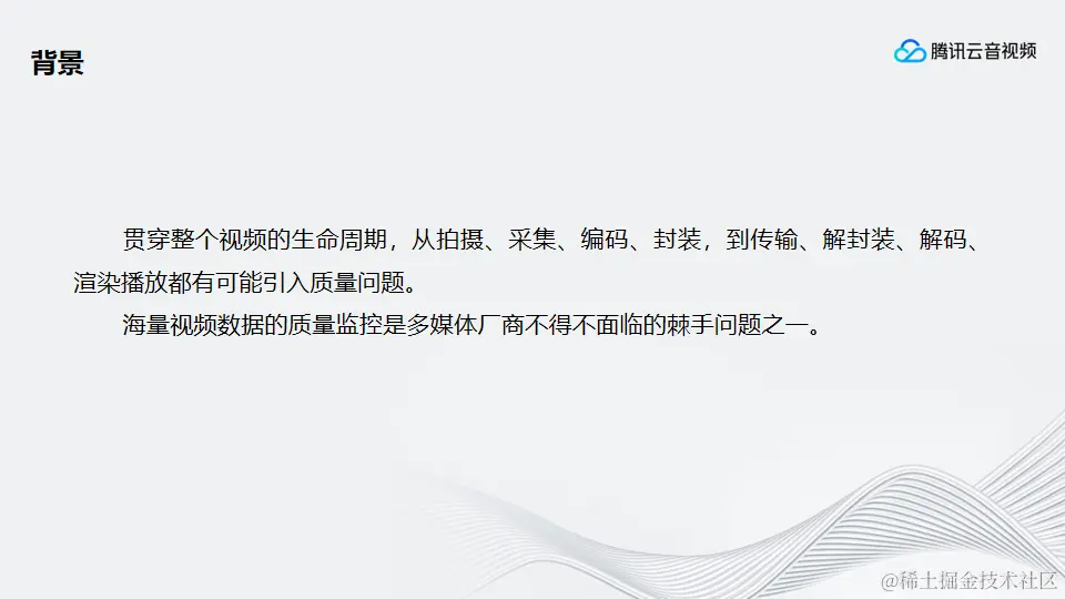 我是来自腾讯云音视频的孙祥学,现在负责腾讯云媒体处理(MPS)产品的后台开发。今天跟大家分享的主题是音视频质检及画质评估。质检的概念大家可能比较陌生,但其实在很早以前,广电领域就有另一个相关的叫法——视频技审,从技术的角度审核视频质量,区别于内容审核,视频内容审核大家应该比较熟悉,审核视频是否涉黄政暴。而质检则是从技术维度去检查视频的问题。