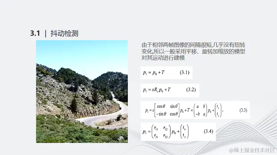 左边的视频是由于摄像载体不稳定导致的画面晃动很厉害,长时间观看很容易头晕。由于相邻两帧图像的间隔很短,几乎没有扭转变化,所以一般采用平移、旋转加缩放的模型对其运动进行建模。第一行的公式就描述了一个平移变化,即X轴和Y轴的像素平移。最终通过推演,得到最后一行的公式。根据模型计算出两帧之间的平移值、旋转值、缩放值,从而判断是否发生抖动。实际应用场景是通过统计一段时间内的平均变化,如果平均值达到阈值,则认为画面抖动情况较为严重。直播流也是类似计算。