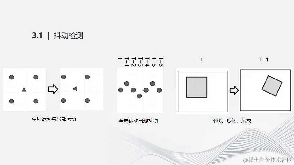 首先来看关于抖动的检测。两帧图像之间的相对运动可以分解为大部分场景的全局运动和小部分场景的局部运动,而全局运动一般代表着摄像机的主观运动。摄像载体的不稳定,会导致在连续的帧间出现上下起伏的运动轨迹。第三幅图表示将t和t+1两帧之间的运动简化为平移、旋转、缩放。