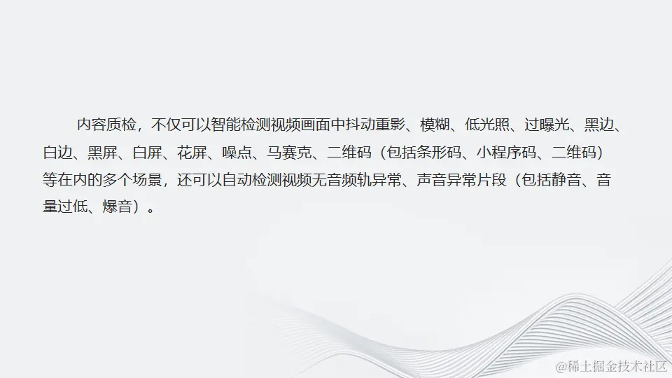 内容质检,不仅可以智能检测视频画面中抖动重影、模糊、低光照、过曝光、黑边、白边、黑屏、白屏、花屏、噪点、马赛克、二维码(包括条形码、小程序码、二维码)等在内的多个场景,还可以自动检测视频无音轨异常、声音异常片段(包括静音、音量过低、爆音)。