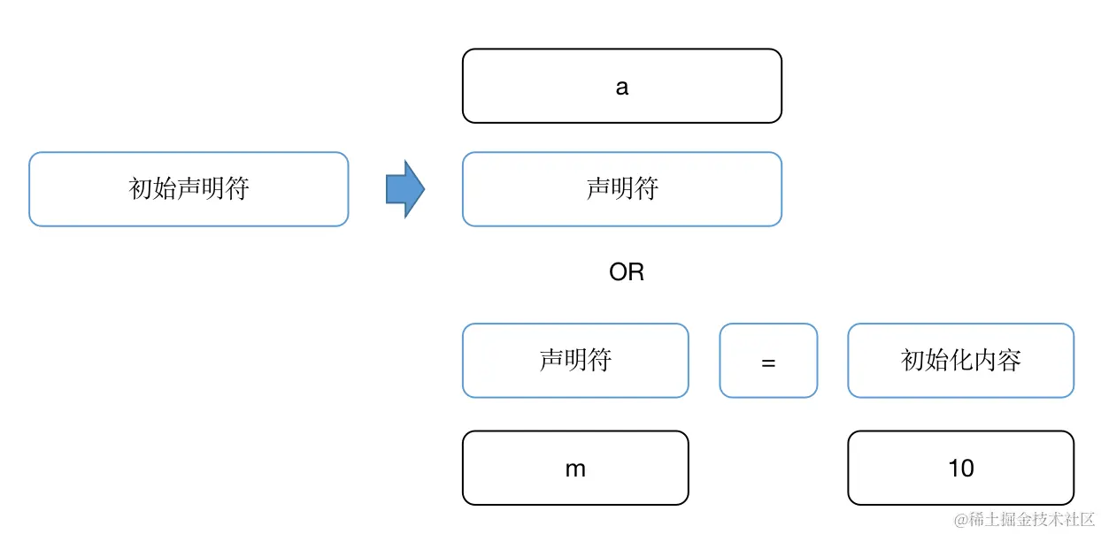 初始声明符是什么鬼??其实就是带初始器的声明符,声明符命名了一个变量,初始器为其指定该变量的与其数据类型相符的值。
