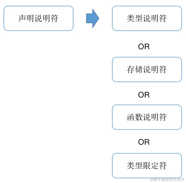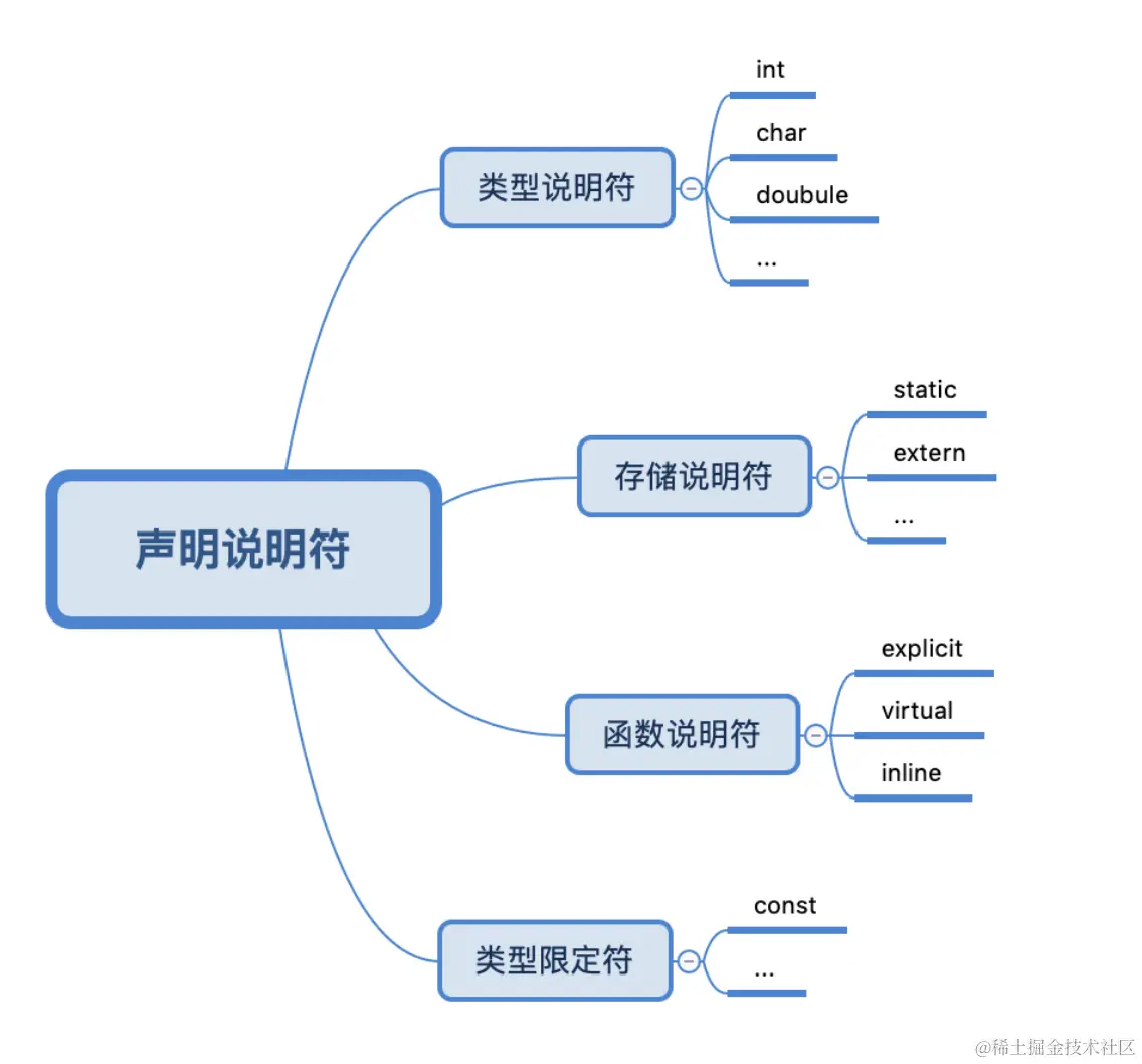 首先,声明的第一个条件是声明说明符。在C语言中声明说明符大概有以下几种: