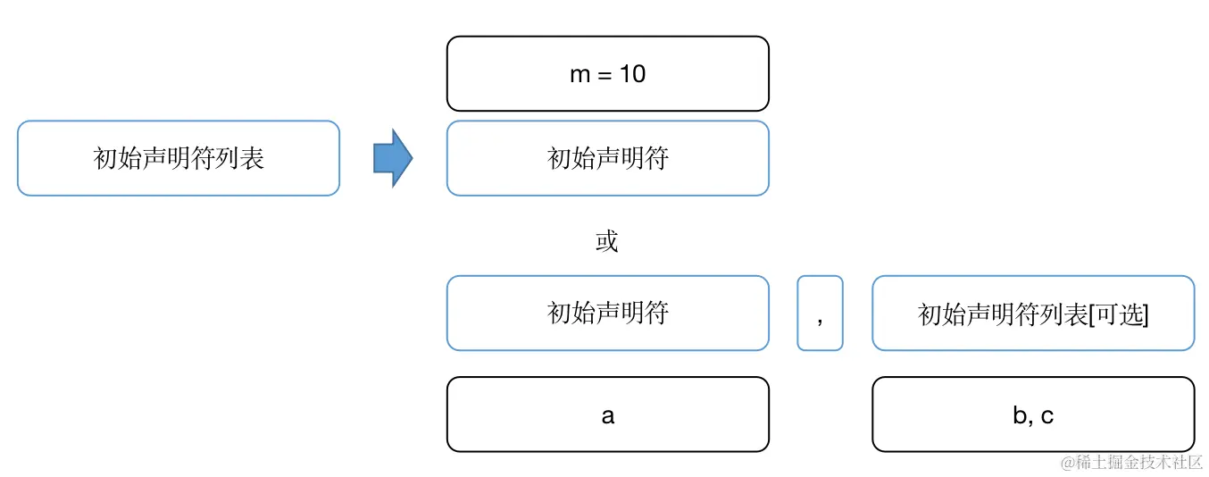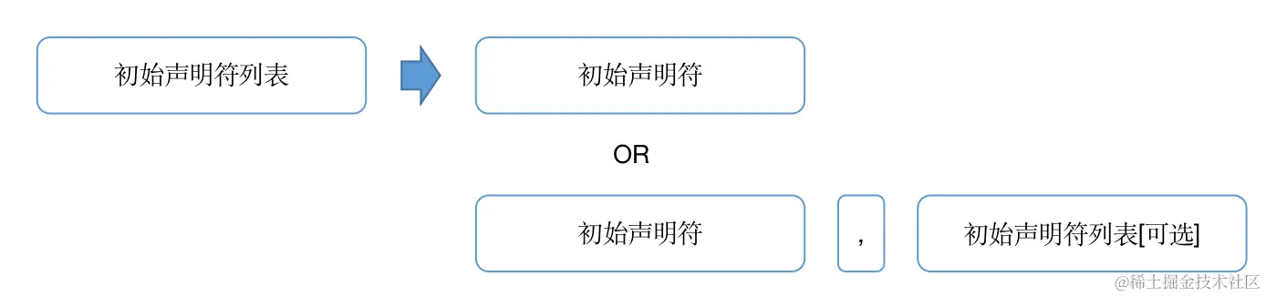 初始声明符列表是由一个或多个初始声明符组成的,那么初始声明符列表的产生式如下: