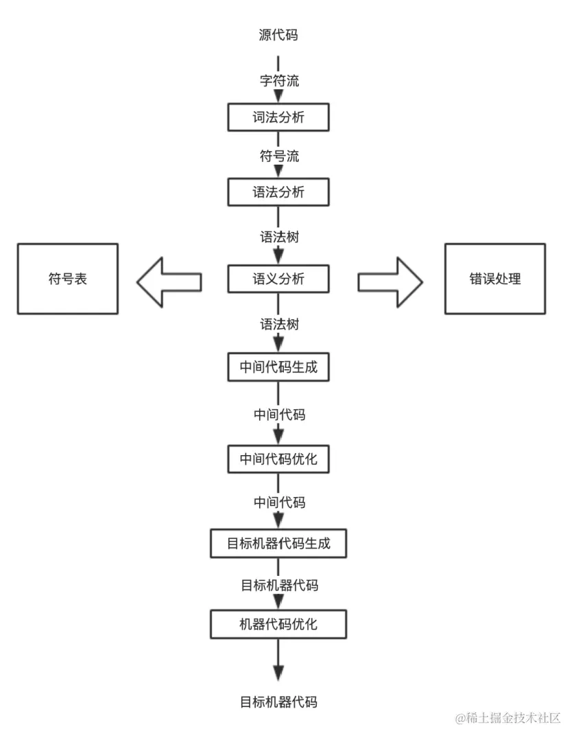 上图描述了源代码到目标机器代码转换过程所需的步骤: