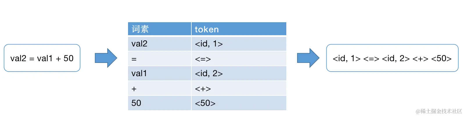 val2映射成词法单元<id, 1>,id表示标识符(identifier)的抽象符号,而1则是指向符号表中val2的记录,这记录存放该标识符的相关信息:名字、类型等=被映射成词法单元<=>,这是一个赋值运算符,没有属性,所以不需要第二个分量。val1映射成词法单元<id, 2>+映射成词法单元<+>50映射成词法单元<60>