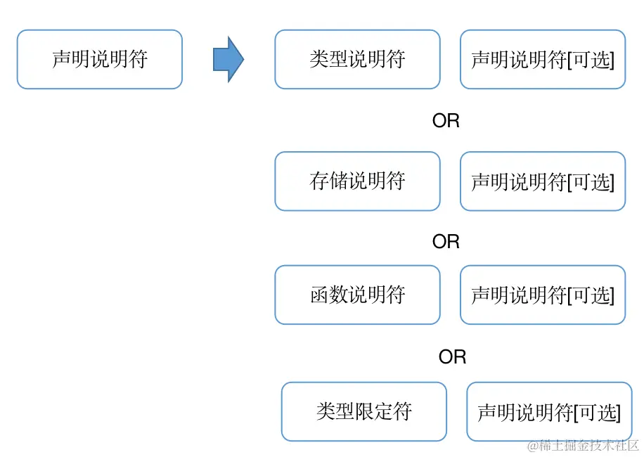 我们在说明符后面加上一个声明说明符, [可选] 的标识表示这个声明说明符可有可无,比如:int a = 0; 声明说明符就是类型说明符int没有后续。但是出现这种情况:long long a;,那么声明说明符就等于 类型说明符 + 类型说明符,这时候第二个long就需要后面的可选说明符来匹配。同理,余下的说明符匹配也是类似的: