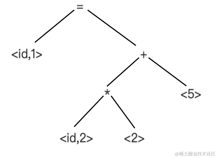 <id,1><=><id,2><*><2><+><5><;> - 语法分析将符号流转换成赋值的语法树,语义分析校验是否符合语法: