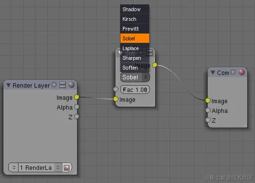 将过滤器类型从默认的“柔化”更改为“Sobel”。现在,如果将筛选器节点输出与“复合”节点输入“图像”链接到“图像”,并运行渲染,您将看到模型为黑色,边缘以不同的颜色勾勒。
