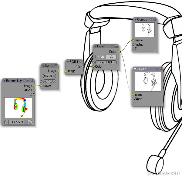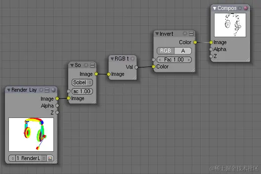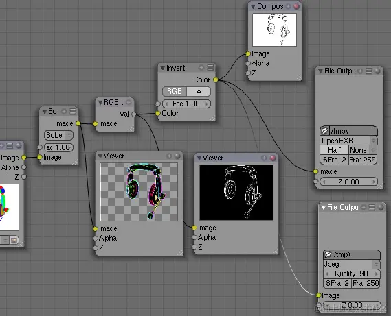 但是,您确实需要边缘为黑色。执行此操作,您必须反转渲染,方法是选择“添加>颜色>反转”菜单项,并将添加的节点链接到过滤器节点的“图像”输出。然后通过选择“添加>转换器-> RGB 到 BW”菜单项,将渲染从“RGB”转换为“黑白”。不要忘记将其链接到前一个节点的输出。转换器的“Val”输出需要链接到“复合”的“图像”输入。注意:您可以将“背景”选项与“查看器”输出节点一起使用,以显示节点架构后面的中间结果。