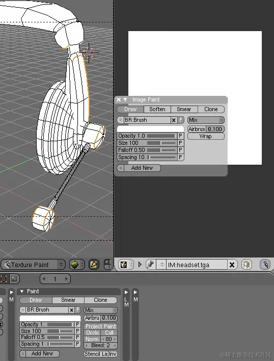 注意:您还可以使用“UV\图像编辑器”窗口进行细微更正,同时检查UV纹理轮廓。该过程与“3D视图”完全相同,仅在按“C”键后可以使用工具选择。此外,请确保在UV窗口中打开“启用图像绘画”按钮(铅笔)。