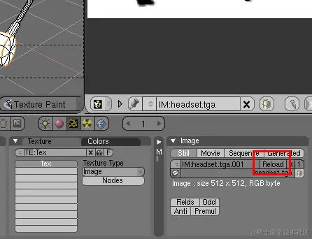 完成后,在“UV\图像编辑器”窗口中按“Alt + S”保存UV纹理,然后按“F6”移动到“纹理按钮”,然后单击“图像”面板上的“重新加载”,将其重新加载到材质纹理中。