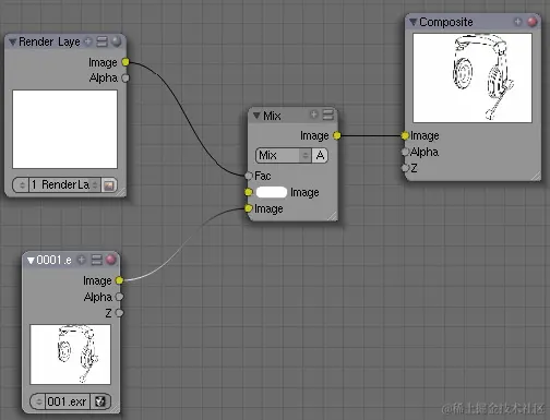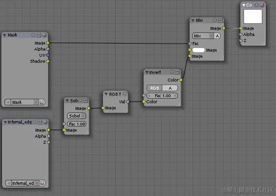 现在修改复合节点以使用保存的图像。在主窗口中切换到“节点编辑器”,单击“复合节点”按钮,然后擦除除“渲染层”和“复合”节点以外的所有节点。选择“添加>输入>图像”菜单选项,将“图像输入”节点添加到我们的架构中,并将图像加载到其中。现在,唯一剩下的就是混合蒙版和生成的边缘。为此,请使用“添加>颜色>混合”菜单项的“混合”节点。使用蒙版作为“混合”节点的白色输入的因素,以指定在边缘渲染上绘制的位置。结果应该是这样的。注: 如果运行渲染,则与初始边选择方案相比,不会有任何变化。默认图像为白色,因此将显示所有边缘。
