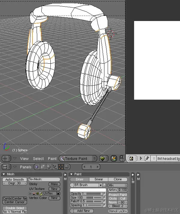 接下来,您需要将面具上不需要的区域涂成黑色。为此,您需要保留之前使用的两个窗口视图(3D 视图和“UV\Image 编辑器”)。在“3D视图”窗口中,选择“纹理绘制”模式,并将“视口着色”设置为“纹理”。然后,要查看可用的绘画工具,请单击“编辑”(F9),然后检查“绘画”子面板。