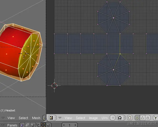 现在,您需要展开模型,并创建遮罩纹理以覆盖边缘。把你创建的边缘放在一边,回到你的模型,以及你留下的灰色材料。这部分可能很棘手。从脚本生成的UV贴图开始,并在必要时进行调整。移回“3D 视图”显示,然后切换到编辑模式(“Tab”键)。拆分视图,然后在另一个窗口中,选择“UV/图像编辑器”选项作为窗口类型。