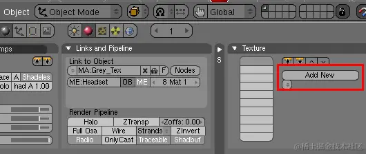 将此纹理添加到您留下的灰色材料中。为此,请移至“着色”面板 (F5),选择“材质按钮”,然后使用“链接和管线”选项卡上的材质选择器选择灰色材质。在“纹理”子面板上,单击“添加新”按钮,以添加纹理草稿。因此,应显示“映射输入”和“映射到”选项卡。