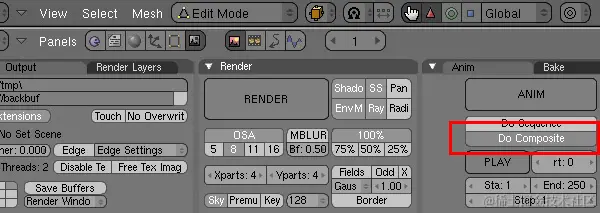 现在,您将使用“复合节点”过滤掉除边缘之外的所有信息。首先,告诉渲染引擎使用合成节点。选择“场景”面板(F10),然后选择“渲染按钮”,然后单击“执行复合”按钮。