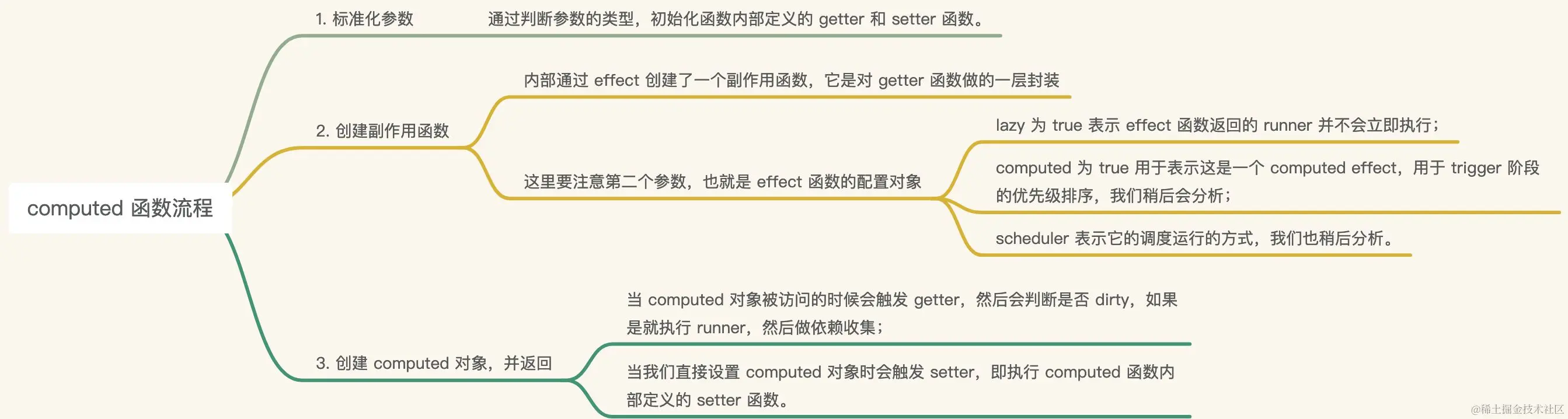 计算属性内部创建副作用函数的时候会配置 computed 为 true,标识这是一个 computed 的 effect,用于在 trigger 阶段的优先级排序。 trigger 阶段执行 effect 的过程: