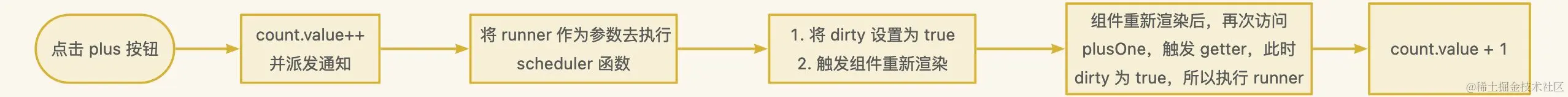 - 修改 count 的值时,它会派发通知先运行 plusOne 内部的 scheduler 函数,把 plusOne 内部的 dirty 变为 true