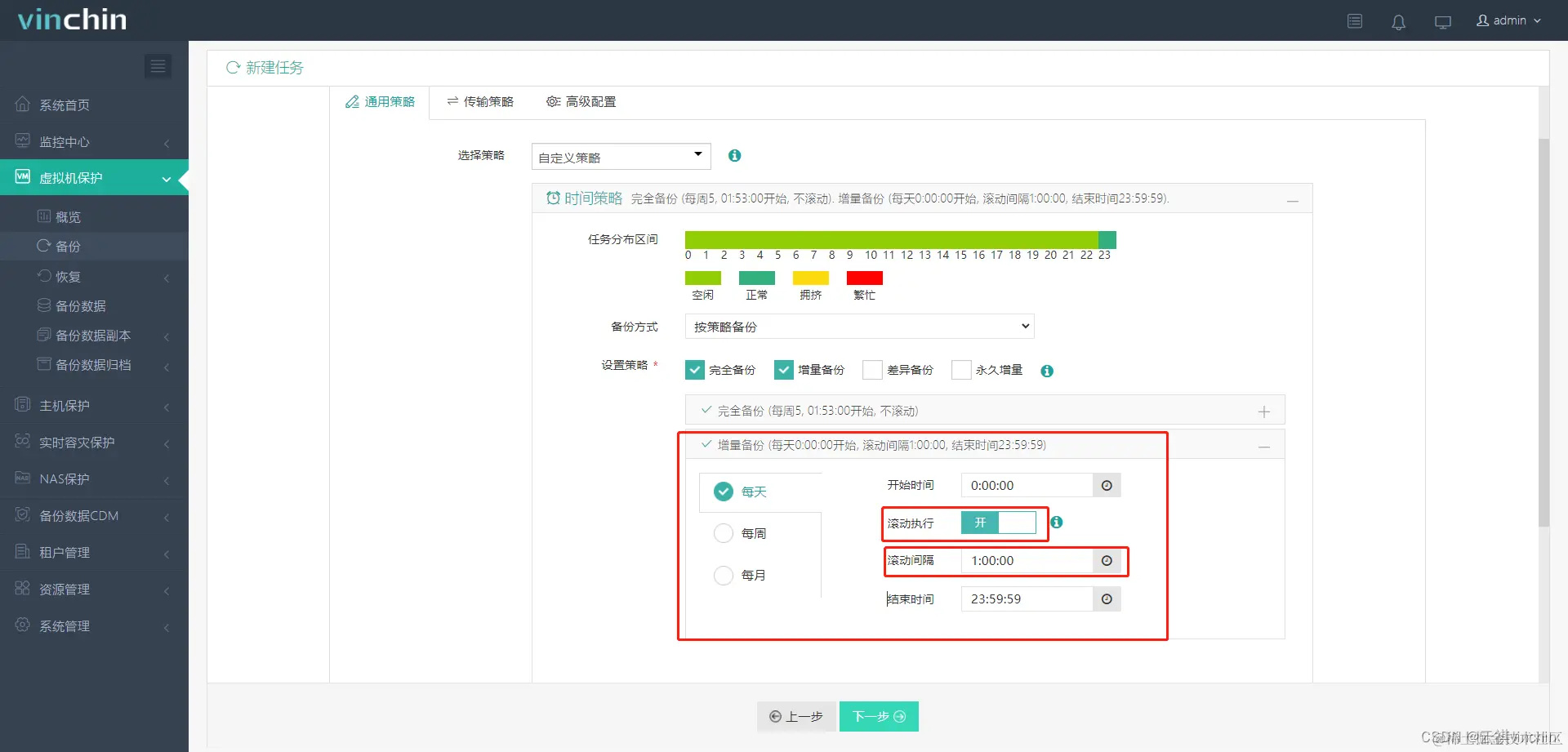在我们云祺容灾备份系统中,通用策略下的时间策略,可以设置备份策略,一般是推荐使用每周进行完全备份+每天进行增量备份的方式,保证备份数据有效可恢复,并且可以尽量减少备份数据量。如果对于备份频率需求高的,可以在增量备份中开启滚动执行,之后即可根据自身需求,选择间隔时间,就如图所示,设置一天时间中,每隔一个小时就进行增量备份。保证了滚动备份对于备份频率的需求,也做到了,减少备份数据量,降低存储压力,节约存储成本。